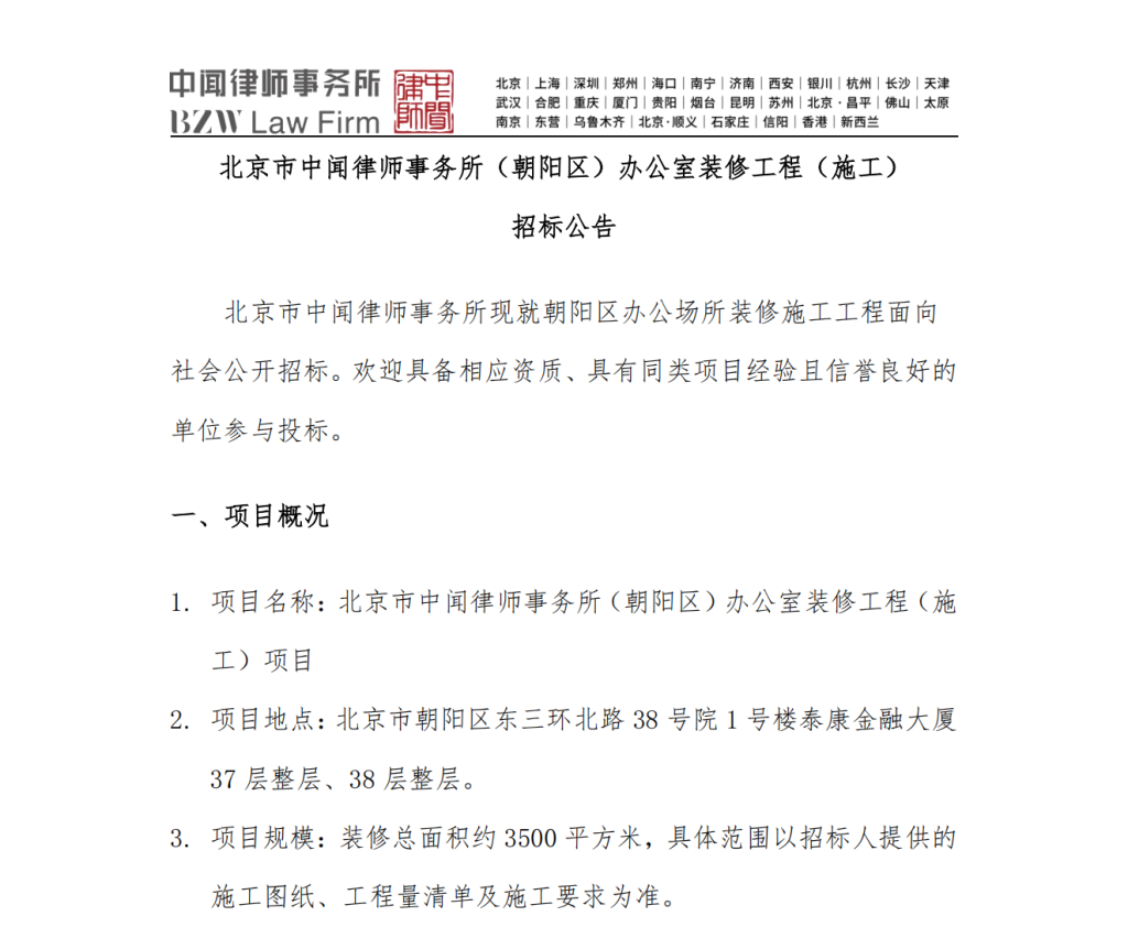 北京市中闻律师事务所现就朝阳区办公场所装修施工工程面向社会公开招标。欢迎具备相应资质、具有同类项目经验且信誉良好的单位参与投标。